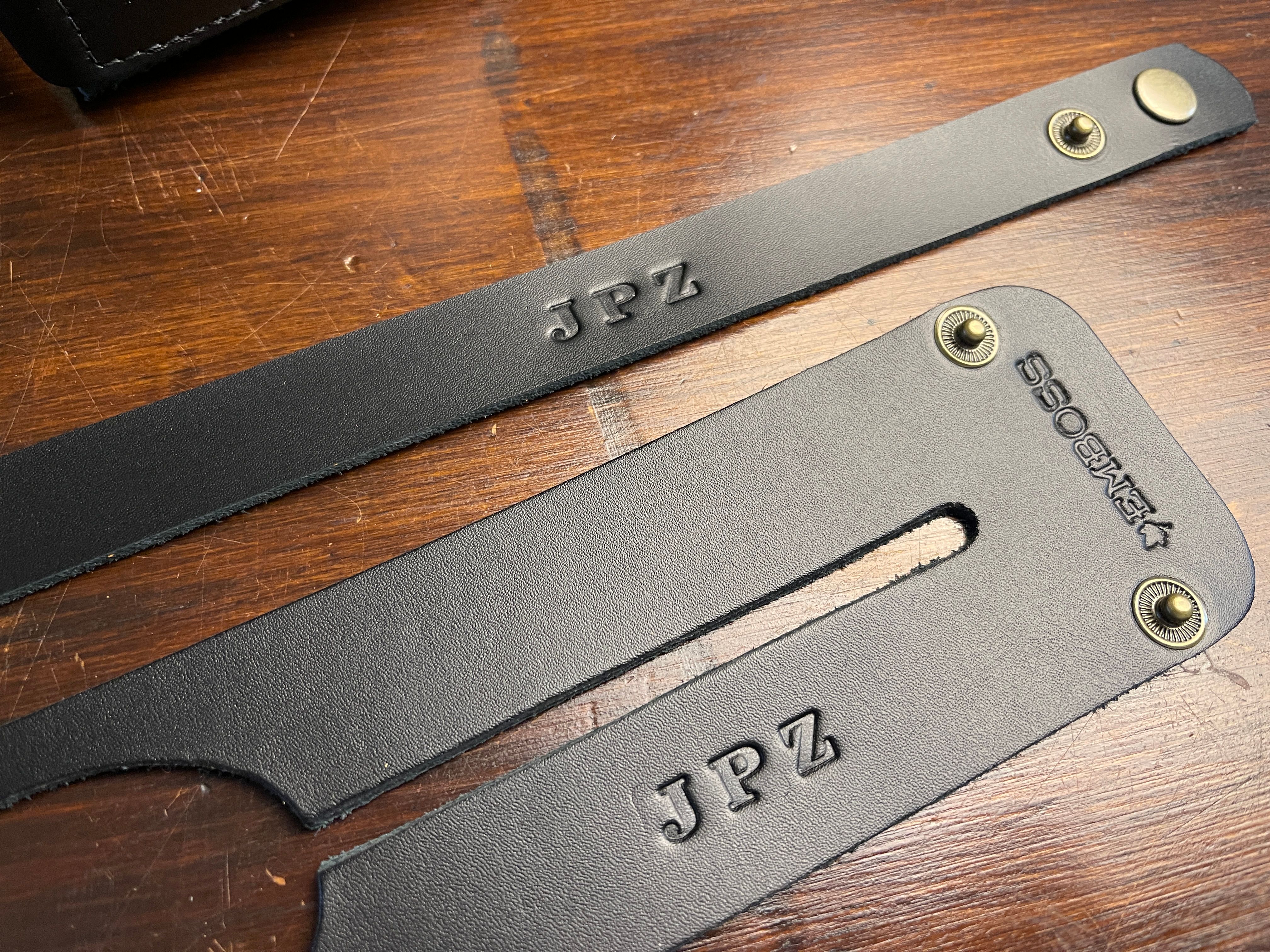 En esta primera imagen se muestra el grabado de iniciales en la tapa de cuero mediante un proceso de estampado con presión y calor.