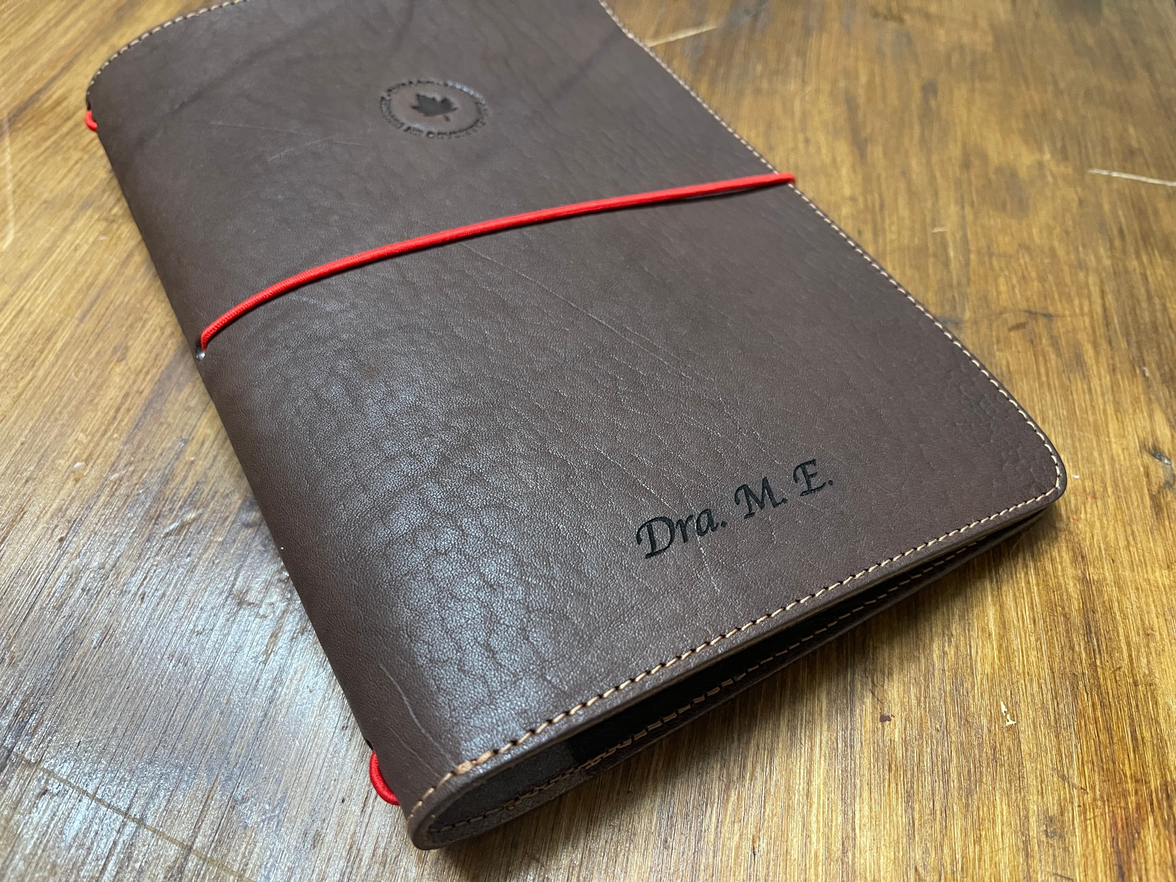 En esta primera imagen se muestra el grabado de iniciales en la tapa de cuero mediante un proceso de estampado con presión y calor.